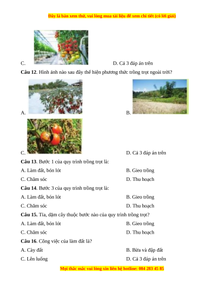 Câu 14. Bước 3 của quy trình trồng trọt là: A. Làm đất, bón lót B. Gieo trồng C. Chăm sóc D. Thu hoạch