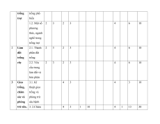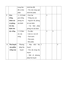 Giới thiệu 1.1. Các - Nhóm cây lương 2 2 về trồng nhóm cây thực trọt trồng phổ - Nhóm cây công biến nghiệp - Nhóm cây ăn quả - Nhóm cây rau - Nhóm cây thuốc - Nhóm cây gia vị - Nhóm cây hoa - Nhóm cây cành - Nhóm cây lấy gỗ 1.2. Một số - Một số phương 2 2 phương thức trong trồng thức, ngành trọt. nghề trong - Một số ngành nghề trồng trọt trong trồng trọt. 2 Làm đất 2.1. Thành - Phần rắn 2 2 trồng cây phần đất - Phần lỏng trồng - Phần khí