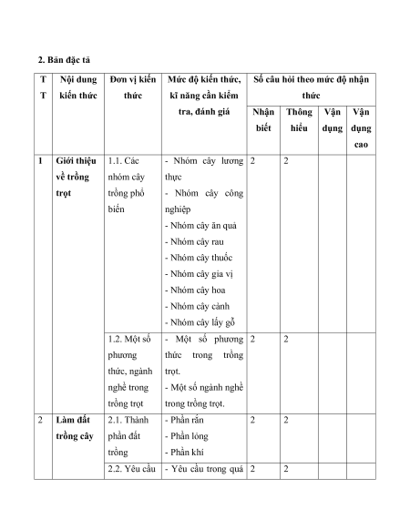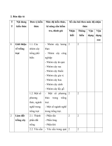 CH gian CH gian CH gian CH gian (phút) (phút) (phút) (phút) 1 Giới 1.1. Các 2 3 2 3 4 6 10 thiệu về nhóm cây trồng trồng phổ trọt biến 1.2. Một số 2 3 2 3 4 6 10 phương thức, ngành nghề trong trồng trọt 2 Làm 2.1. Thành 2 3 2 3 4 6 10 đất phần đất trồng trồng cây 2.2. Yêu 2 3 2 3 4 6 10 cầu trong làm đất và bón phân 3 Gieo 3.1. Kĩ 4 3 4 3 10 trồng, thuật gieo chăm trồng và sóc và phòng trừ phòng sâu bệnh trừ sâu, 3. 2.Chăm 4 3 1 10 4 1 13 30 bệnh sóc cây cho cây trồng trồng 4 Thu Phương 1 5 20 hoạch pháp thu sản hoạch phẩm trồng trọt Tổng 8 12 16 18 1 10 1 5 24 2 45 Tỉ lệ (%) 20 % 40 % 20 % 20 % 100% Tỉ lệ chung (%) 60 % 40 % 2. Bản đặc tả T Nội dung