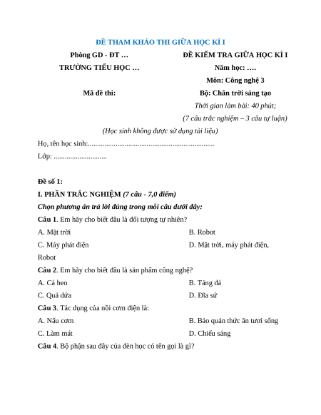 - Tailieugiaovien.com.vn giới thiệu 3 đề giữa kì 1 gồm đầy đủ ma trận và lời giải chi tiết môn Công nghệ lớp 3 Chân trời sáng tạo mới nhất nhằm giúp Giáo viên có thêm tài liệu tham khảo ra đề thi Công nghệ lớp 3.