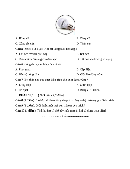 Câu 4. Bộ phận sau đây của đèn học có tên gọi là gì? A. Bóng đèn B. Chụp đèn C. Công tắc đèn D. Thân đèn