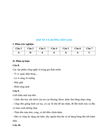 Câu 8 (1 điểm). Em hãy kể tên những sản phẩm công nghệ có trong gia đình mình.
