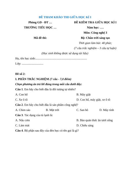 - Tailieugiaovien.com.vn giới thiệu 3 đề giữa kì 1 gồm đầy đủ ma trận và lời giải chi tiết môn Công nghệ lớp 3 Chân trời sáng tạo mới nhất nhằm giúp Giáo viên có thêm tài liệu tham khảo ra đề thi Công nghệ lớp 3.
