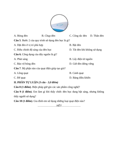 Câu 9 (1 điểm). Em làm gì khi thấy chiếc đèn học đang bật sáng, nhưng không thấy người sử dụng?