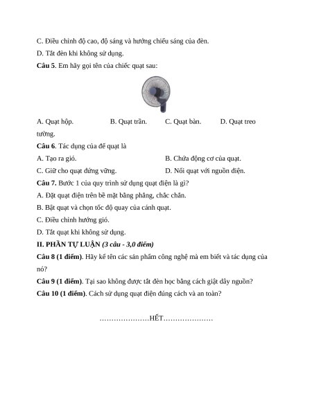 Câu 10 (1 điểm). Cách sử dụng quạt điện đúng cách và an toàn?