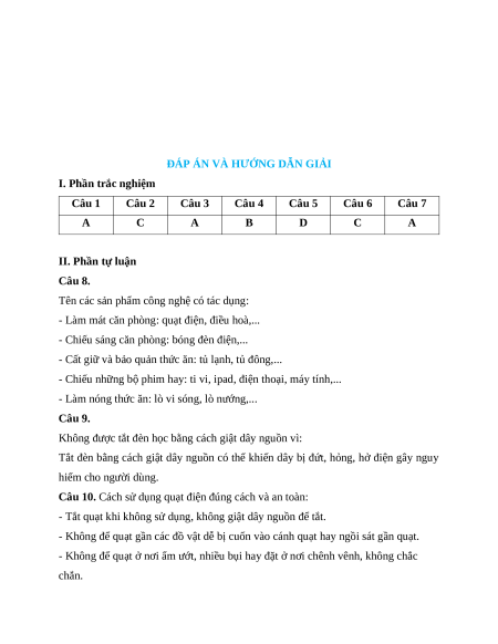 I. Phần trắc nghiệm Câu 1 Câu 2 Câu 3 Câu 4 Câu 5 Câu 6 Câu 7 A C A B D C A II. Phần tự luận Câu 8.