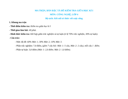 - Tailieugiaovien.com.vn giới thiệu bộ 3 đề giữa kì 1 gồm đầy đủ ma trận và lời giải chi tiết môn Công nghệ lớp 4 Kết nối tri thức mới nhất nhằm giúp Giáo viên có thêm tài liệu tham khảo ra đề thi Công nghệ lớp 4.
