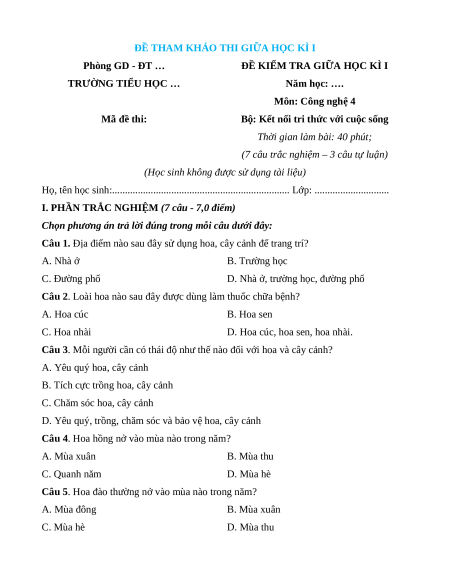(7 câu trắc nghiệm – 3 câu tự luận)