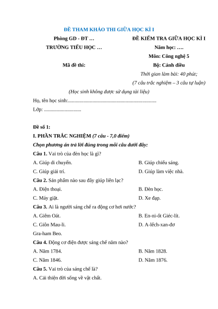 TRƯỜNG TIỂU HỌC … Năm học: …. Môn: Công nghệ 5 Mã đề thi: Bộ: Cánh diều