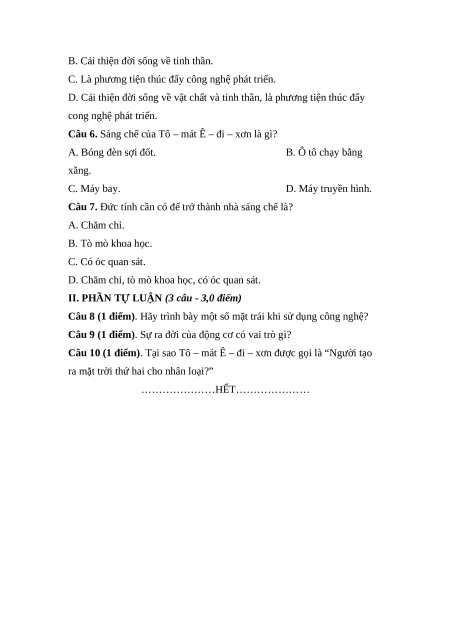 Câu 10 (1 điểm). Tại sao Tô – mát Ê – đi – xơn được gọi là “Người tạo