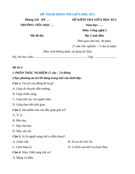 TRƯỜNG TIỂU HỌC … Năm học: …. Môn: Công nghệ 5 Mã đề thi: Bộ: Cánh diều