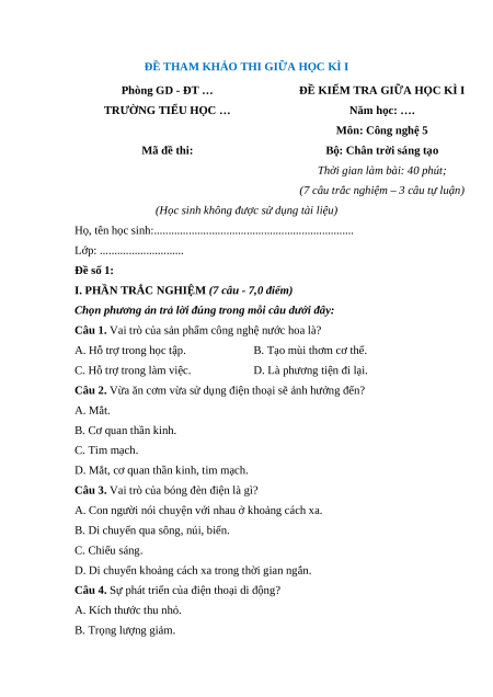 - Tailieugiaovien.com.vn giới thiệu bộ đề giữa kì 1 gồm đầy đủ ma trận và lời giải chi tiết môn Công nghệ lớp 5 Chân trời sáng tạo mới nhất năm 2024 nhằm giúp Giáo viên có thêm tài liệu tham khảo ra đề thi Khoa học lớp 5.