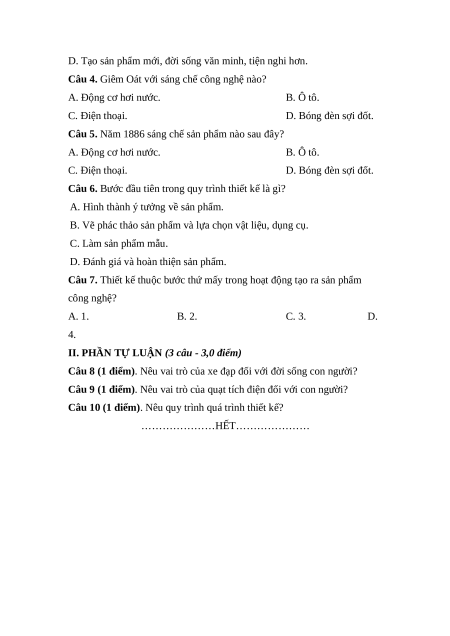 Câu 5. Năm 1886 sáng chế sản phẩm nào sau đây? A. Động cơ hơi nước. B. Ô tô. C. Điện thoại. D. Bóng đèn sợi đốt.