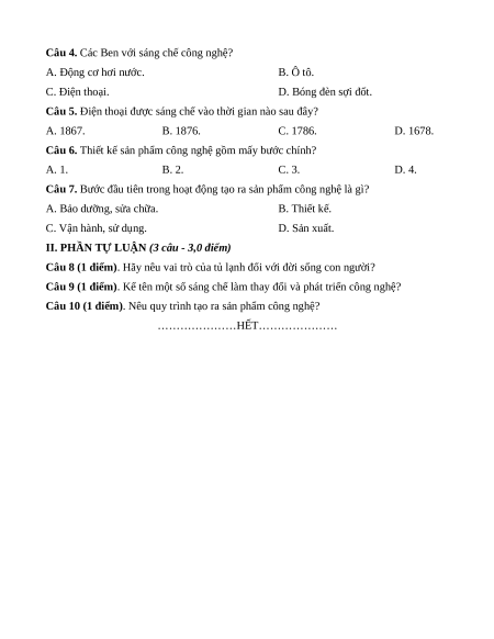 Câu 4. Các Ben với sáng chế công nghệ? A. Động cơ hơi nước. B. Ô tô. C. Điện thoại. D. Bóng đèn sợi đốt.