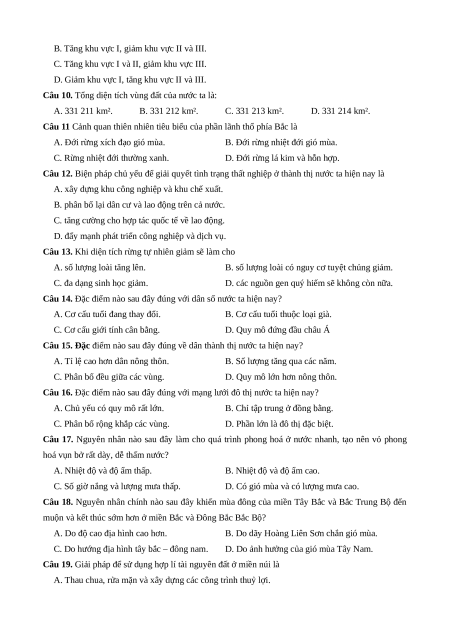 Câu 10. Tổng diện tích vùng đất của nước ta là: A. 331 211 km². B. 331 212 km². C. 331 213 km². D. 331 214 km².