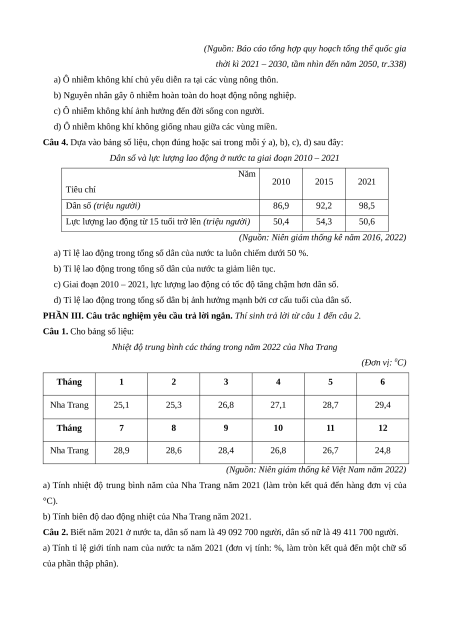 nhiên và bảo vệ môi trường Dân số Việt Nam 2 2 Lao động và việc làm 1 1 2 Đô thị hóa 2 1 3 Tổng phần 1 12 8 20 câu