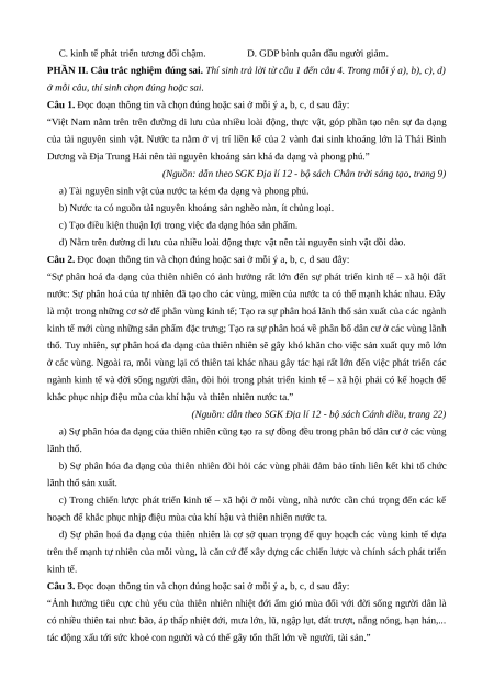 ở mỗi câu, thí sinh chọn đúng hoặc sai.