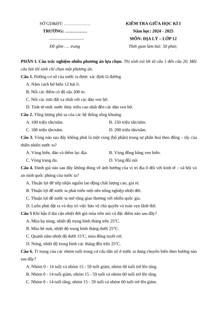 - Tailieugiaovien.com.vn giới thiệu bộ đề giữa kì 1 gồm đầy đủ ma trận và lời giải chi tiết môn Địa lý 12 Chân trời sáng tạo mới nhất năm 2024 nhằm giúp Giáo viên có thêm tài liệu tham khảo ra đề thi Địa lý 12.