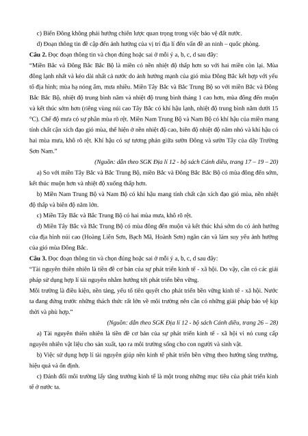 Đề thi giữa kì 1 Địa lý 12 Chân trời sáng tạo (Đề 3)