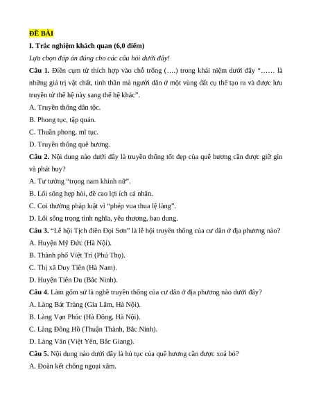 Câu 5. Nội dung nào dưới đây là hủ tục của quê hương cần được xoá bỏ?