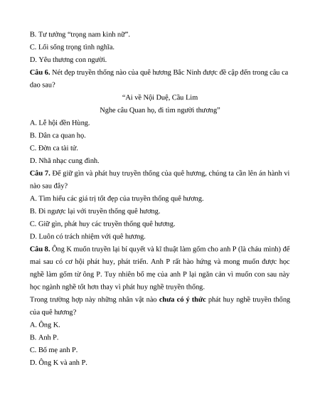 Câu 6. Nét đẹp truyền thống nào của quê hương Bắc Ninh được đề cập đến trong câu ca dao sau?