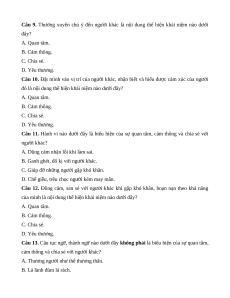 Câu 9. Thường xuyên chú ý đến người khác là nội dung thể hiện khái niệm nào dưới đây? A. Quan tâm. B. Cảm thông. C. Chia sẻ. D. Yêu thương.