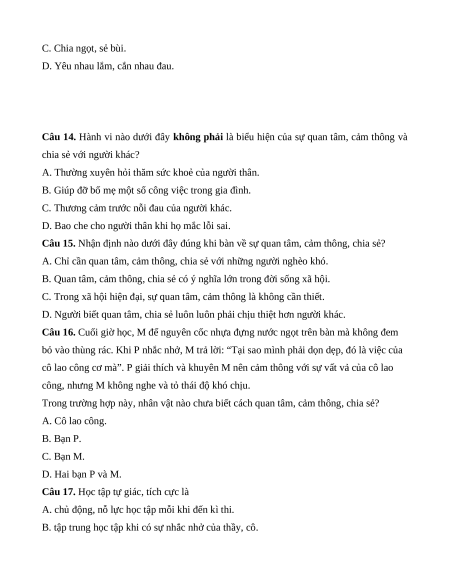 Câu 14. Hành vi nào dưới đây không phải là biểu hiện của sự quan tâm, cảm thông và