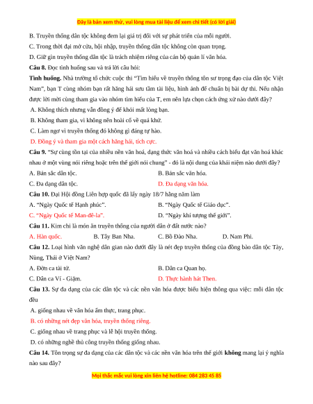 Câu 13. Sự đa dạng của các dân tộc và các nền văn hóa được biểu hiện thông qua việc: mỗi dân tộc đều