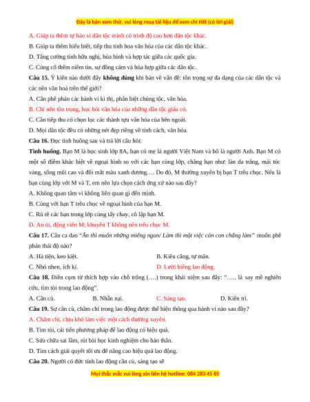 Câu 15. Ý kiến nào dưới đây không đúng khi bàn về vấn đề: tôn trọng sự đa dạng của các dân tộc và