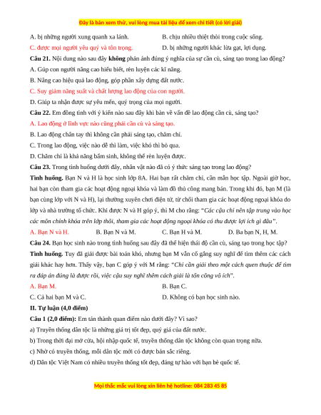 Câu 20. Người có đức tính lao động cần cù, sáng tạo sẽ