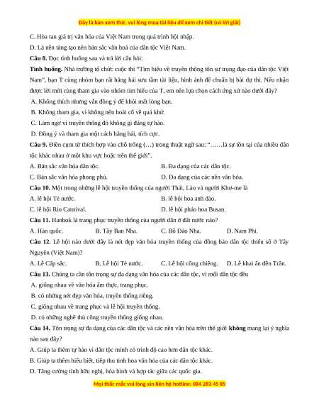 Câu 13. Chúng ta cần tôn trọng sự đa dạng văn hóa của các dân tộc, vì mỗi dân tộc đều