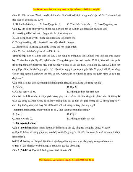 Câu 20. Người có đức tính lao động cần cù, sáng tạo sẽ