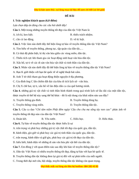 Câu 1. Một trong những truyền thống tốt đẹp của dân tộc Việt Nam là A. ích kỉ, keo kiệt. B. thiếu trách nhiệm. C. cần cù lao động. D. vô kỉ luật.