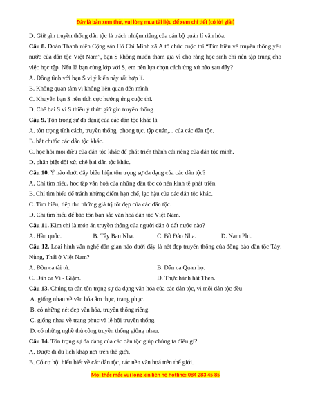 Câu 10. Ý nào dưới đây biểu hiện tôn trọng sự đa dạng của các dân tộc?