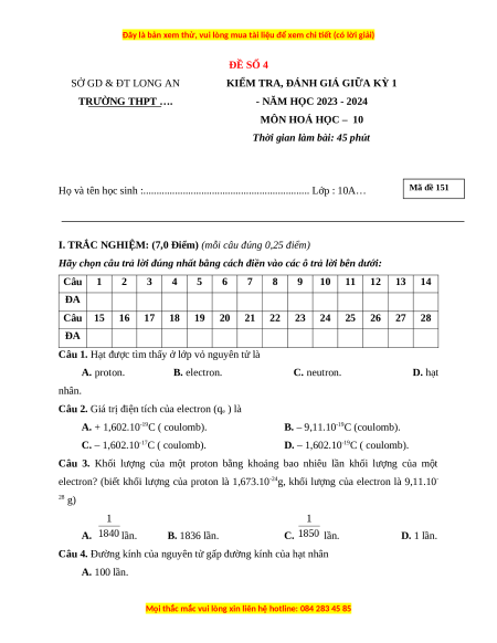 Họ và tên học sinh :............................................................... Lớp : 10A… Mã đề 151