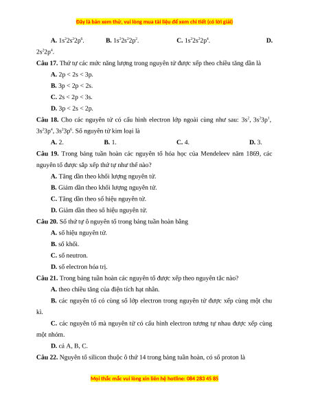 Câu 17. Thứ tự các mức năng lượng trong nguyên tử được xếp theo chiều tăng dần là A. 2p < 2s < 3p. B. 3p < 2p < 2s. C. 2s < 2p < 3s. D. 3p < 2s < 2p.