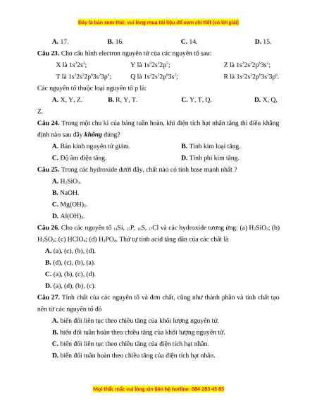 Câu 18. Cho các nguyên tử có cấu hình electron lớp ngoài cùng như sau: 3s2, 3s23p1,