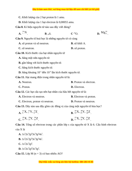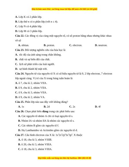 Câu 22. Các đồng vị của cùng một nguyên tố, có số proton bằng nhau nhưng khác nhau về số A. obitan. B. proton. C. electron. D. neutron.