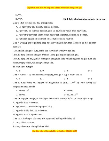Câu 5. Cho mô hình cấu tạo nguyên tử của carbon