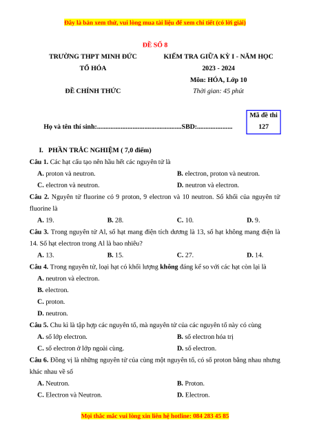 KIỂM TRA GIỮA KỲ I - NĂM HỌC TỔ HÓA 2023 - 2024 Môn: HÓA, Lớp 10 ĐỀ CHÍNH THỨC Thời gian: 45 phút Mã đề thi