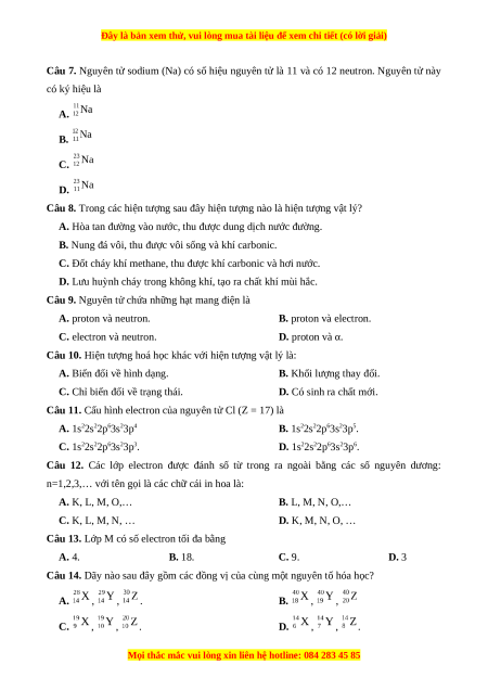 Câu 7. Nguyên tử sodium (Na) có số hiệu nguyên tử là 11 và có 12 neutron. Nguyên tử này có ký hiệu là A. B. C. D.