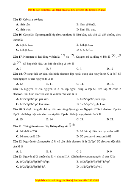 Câu 15. Orbital s có dạng A. hình cầu. B. hình số 8 nổi. C. hình tròn. D. hình bầu dục.