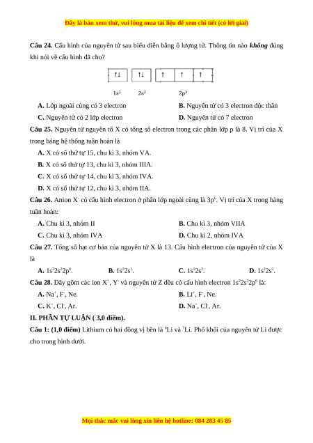 Câu 25. Nguyên tử nguyên tố X có tổng số electron trong các phân lớp p là 8. Vị trí của X