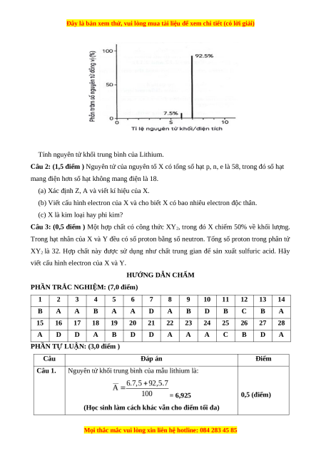 Câu 1: (1,0 điểm) Lithium có hai đồng vị bền là 6Li và 7Li. Phổ khối của nguyên tử Li được cho trong hình dưới.