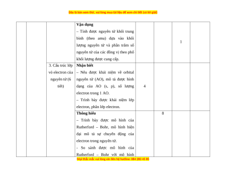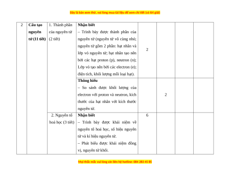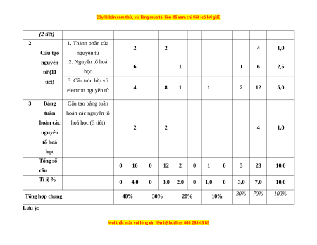 (2 tiết) 2 1. Thành phần của 2 2 4 1,0 Cấu tạo nguyên tử nguyên 2. Nguyên tố hoá 6 1 1 6 2,5 tử (11 học tiết) 3. Cấu trúc lớp vỏ electron nguyên tử 4 8 1 1 2 12 5,0 3 Bảng Cấu tạo bảng tuần tuần hoàn các nguyên tố hoàn các hoá học (3 tiết) 2 2 4 1,0 nguyên tố hoá học Tổng số 0 16 0 12 2 0 1 0 3 28 10,0 câu Tỉ lệ % 0 4,0 0 3,0 2,0 0 1,0 0 3,0 7,0 10,0 Tổng hợp chung 40% 30% 20% 10% 30% 70% 100% Lưu ý: