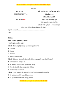ĐỀ KIỂM TRA GIỮA HỌC KÌ I TRƯỜNG THPT … Năm học: …. Môn: Hóa học 10 Mã đề thi: 002
