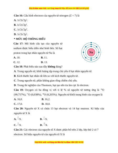 Câu 16: Cấu hình electron của nguyên tử nitrogen (Z = 7) là