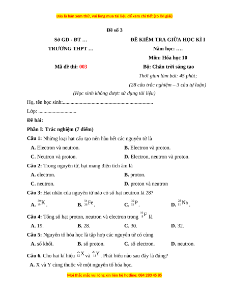 ĐỀ KIỂM TRA GIỮA HỌC KÌ I TRƯỜNG THPT … Năm học: …. Môn: Hóa học 10 Mã đề thi: 003