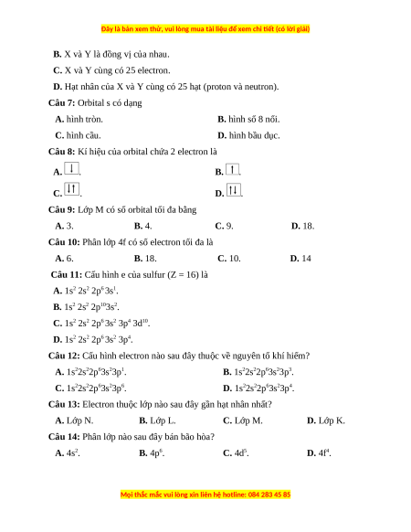 Câu 8: Kí hiệu của orbital chứa 2 electron là A. . B. . C. . D. .