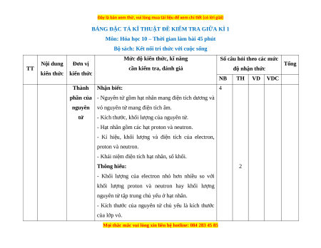 BẢNG ĐẶC TẢ KĨ THUẬT ĐỀ KIỂM TRA GIỮA KÌ 1